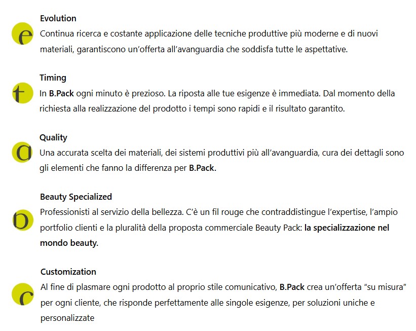Al fine di plasmare ogni prodotto al proprio stile comunicativo, Beauty Pack crea un’offerta “su misura” per ogni cliente, che risponde perfettamente alle singole esigenze, per soluzioni uniche e personalizzate